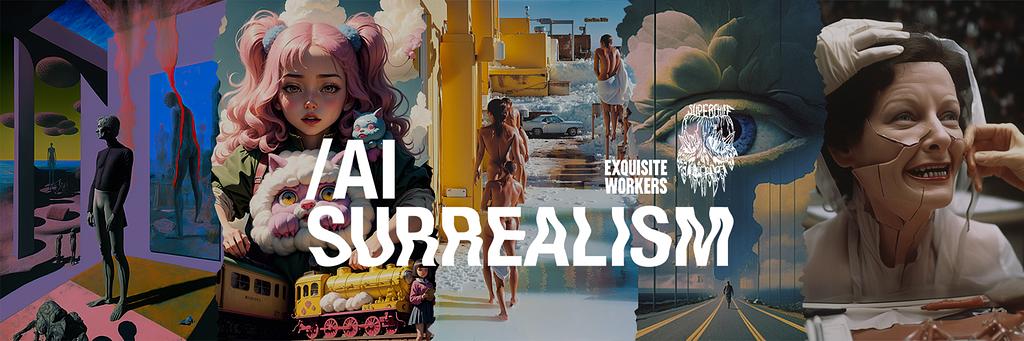 AI Surrealism show official flyer by Exquisite Workers Superchief Gallery NFT. Exhibition of 100 AI artists curated by Anna Dart and Roger Haus.